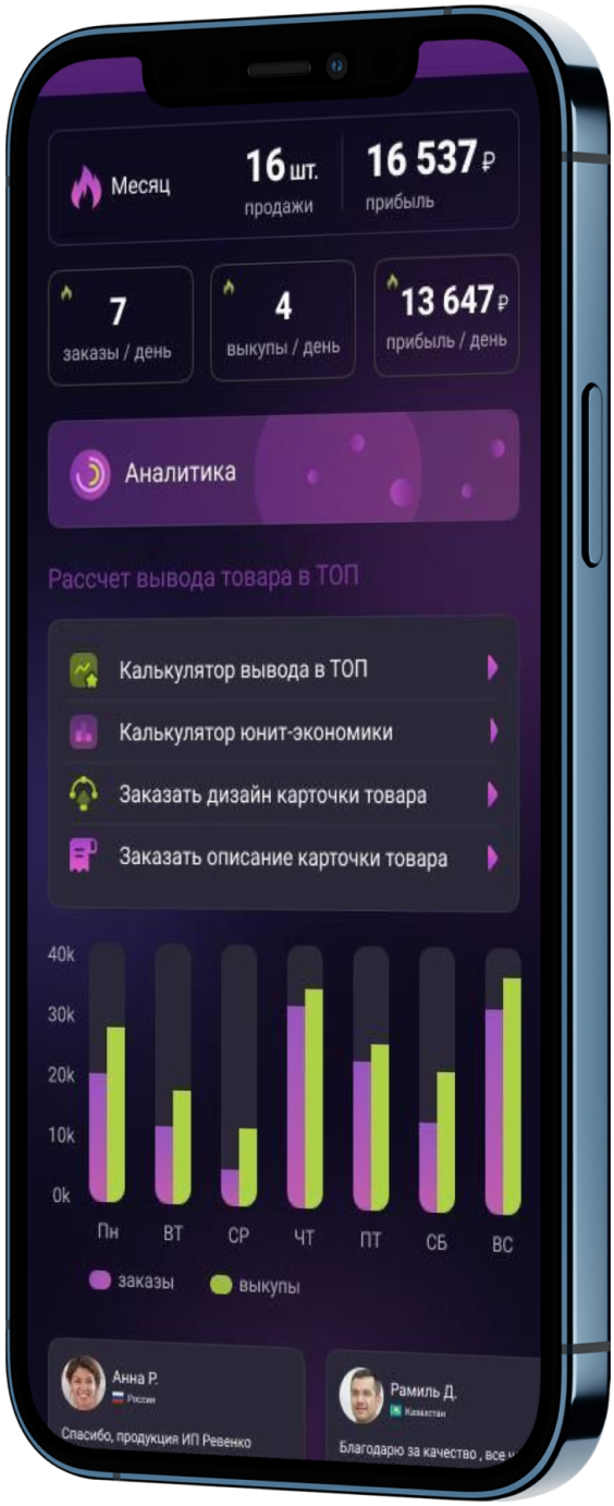Следите за своими продажами за месяцы и дни, прибылью и остатками. Контролируйте отзывы и свой бизнес.